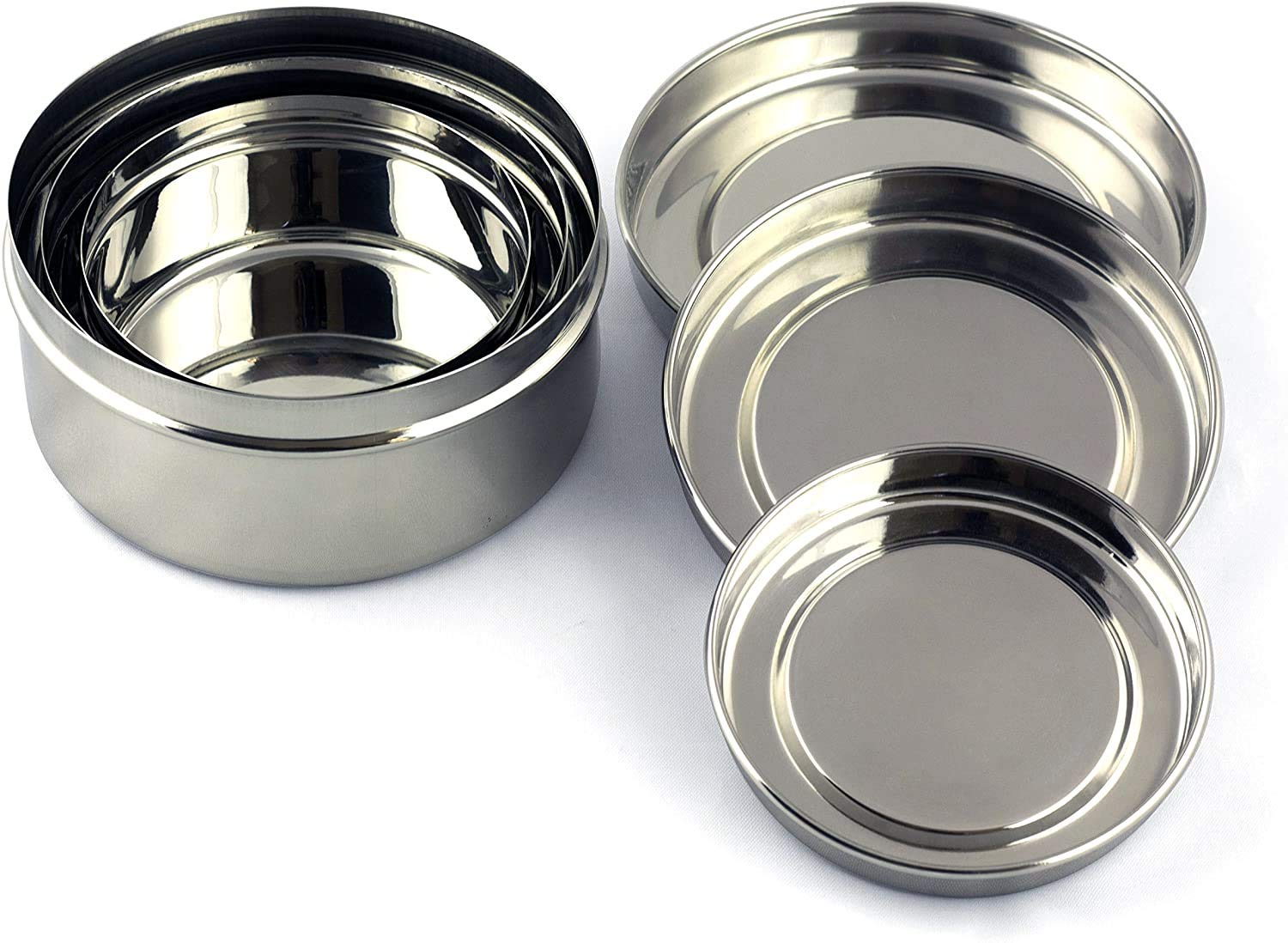Vinod Stainless Steel Puri Dabba, Storage Containers made from the finest stainless steel material which ensures strength, quality, and durability. This attractive mirror finishes flat canister can use to store Puris, Rotis, Parathas, Snacks, Khakhara, mukhwas, dry fruits, chocolates, biscuits, etc. This flat storage container is rustproof and hygienic. All 4 Containers are of Different sizes which will fulfill all your Storage Needs Easy to clean and all are dishwasher safe. When not in use a smaller container can be stacked inside bigger containers saving a lot of storage space.