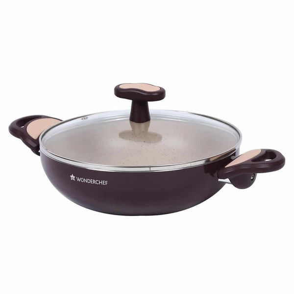 A: Wonderchef Burlington Set pans are made with pure grade virgin aluminium for quick and even heat distribution. They are coated with a health-friendly 5 layer Meta Tuff nonstick coating which is safe for daily use. The pans are strong and long lasting with 2.5mm thickness. They are 100% PFOA free, heavy metal and nickel free for your safety. The ergonomically designed soft touch handles and knob do not heat up during cooking. The pans come with easy clean and care instructions. Wonderchef Burlington Set comes with a reliable Wonderchef Warranty of 2 years. The cookware set of 3 (wok, fry pan and saucepan) looks elegant in the kitchen and on the dining table with the dual tone muted colours and seamless design.