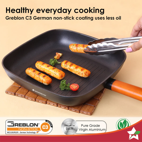 Caesar 24 cm Non-stick Grill Pan with Wooden Handle | Grill Pan Non-Stick | 1.4L | 5mm | Black