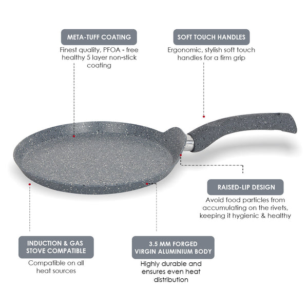 A. Wonderchef Granite Dosa Tawa is a designer forged pan made with pure grade virgin aluminium for quick and even heat distribution. The perfect solution to cook healthy, low fat and delicious meals at home. It needs very less oil to cook as it has a health-friendly 5 layer Meta Tuff non-stick coating. It is strong and long lasting with 3.5mm thickness. The long handle is ergonomic and gives a comfortable secure grip. Ergonomically designed soft touch handles that do not heat up during cooking. It is 100% PFOA free, heavy metal and nickel free for your safety and has a health-friendly 5 layer Meta Tuff non-stick coating for daily use.