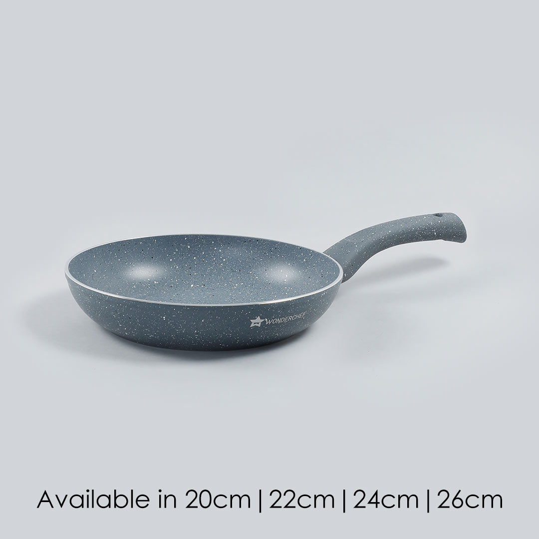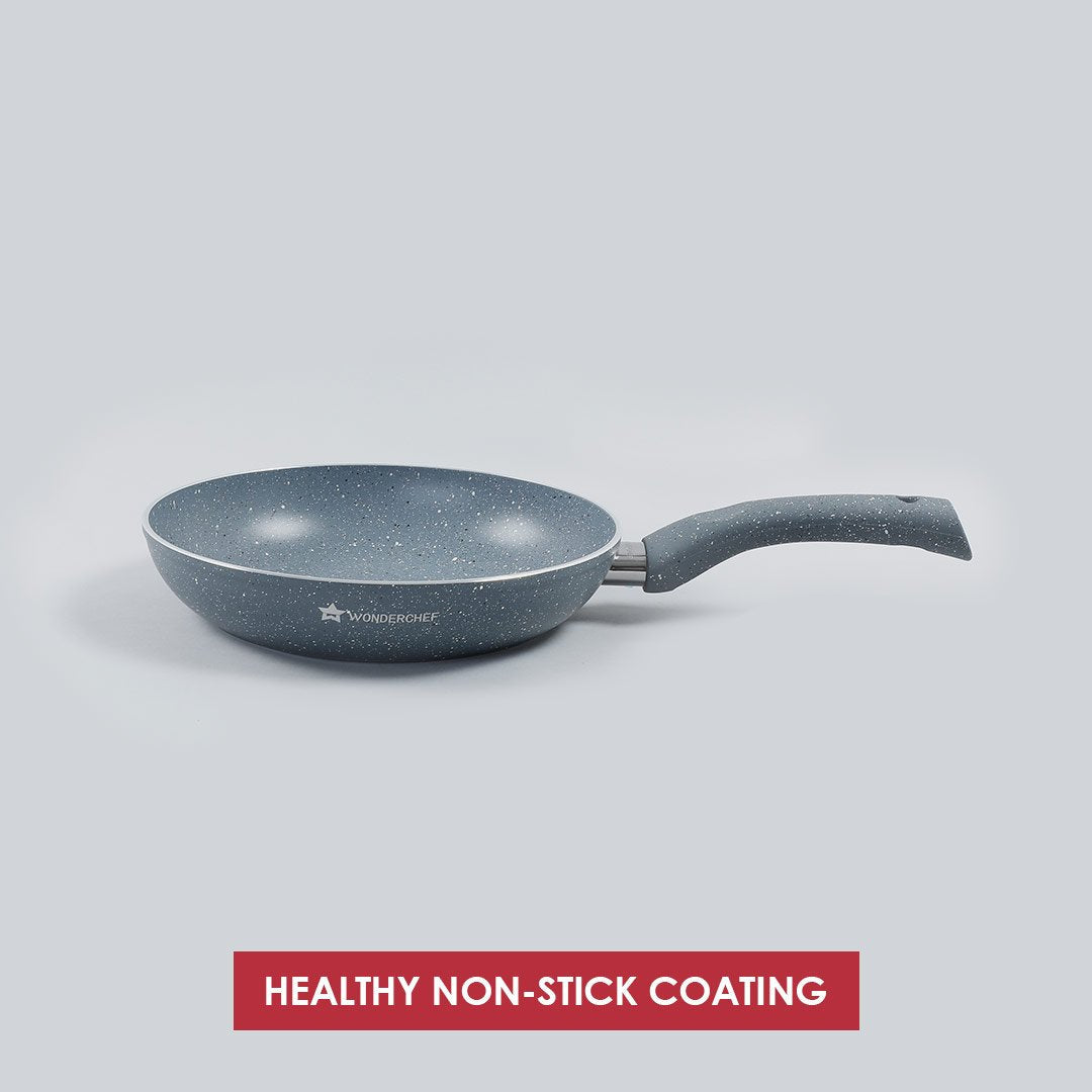 A. Wonderchef Granite Fry Pan is a designer forged pan made with pure grade virgin aluminium for quick and even heat distribution. It is strong and long lasting with 3.5mm thickness. It is ideal for everyday cooking and needs no oil or very less oil to cook. It is a perfect solution to cook healthy, low fat and delicious meals at home. The long handle is ergonomic and gives a comfortable secure grip. Ergonomically designed soft touch handles and knob that do not heat up during cooking. It is 100% PFOA free, heavy metal and nickel free for your safety and has a health-friendly 5 layer Meta Tuff non-stick coating for daily use.