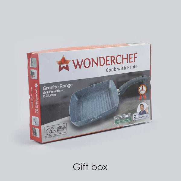 A. Wonderchef Granite Grill Pan is a designer forged pan made with pure grade virgin aluminium for quick and even heat distribution. It is ideal for everyday cooking and the grill pan is a great alternative to outdoor grilling. The perfect solution to cook healthy, low fat and delicious meals at home. It is strong and long lasting with 3.5mm thickness.The long handle is ergonomic and gives a comfortable secure grip. Ergonomically designed soft touch handles that do not heat up during cooking. It is 100% PFOA free, heavy metal and nickel free for your safety and has a health-friendly 5 layer Meta Tuff non-stick coating for daily use.