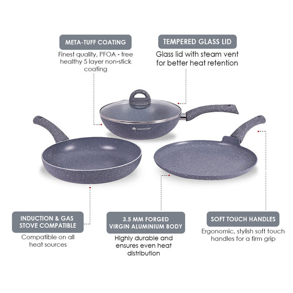 b) Durability: Wonderchef Granite Set is strong and long-lasting with 3.5mm thickness It has better retention of heat and holds non-stick coating more firmly.