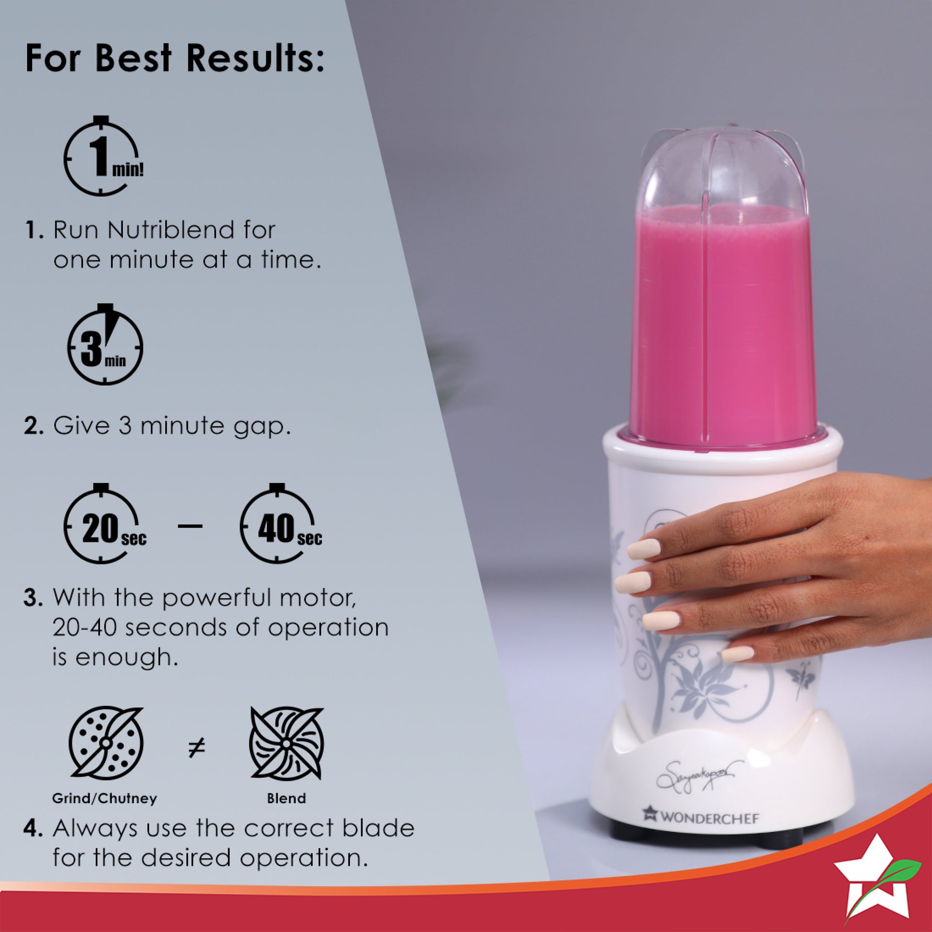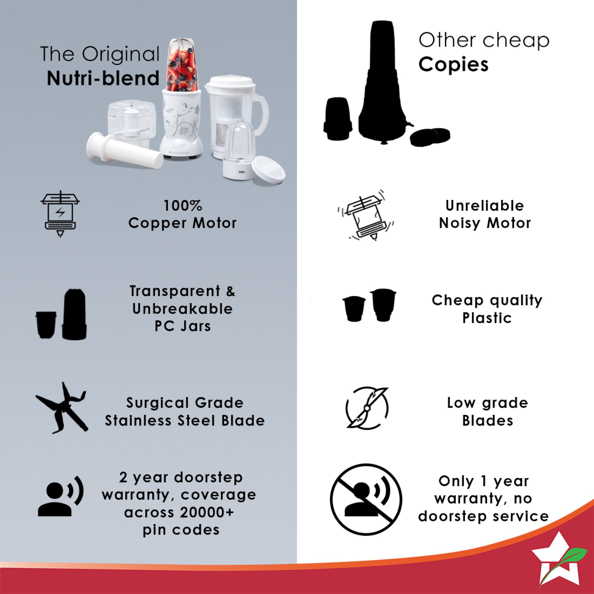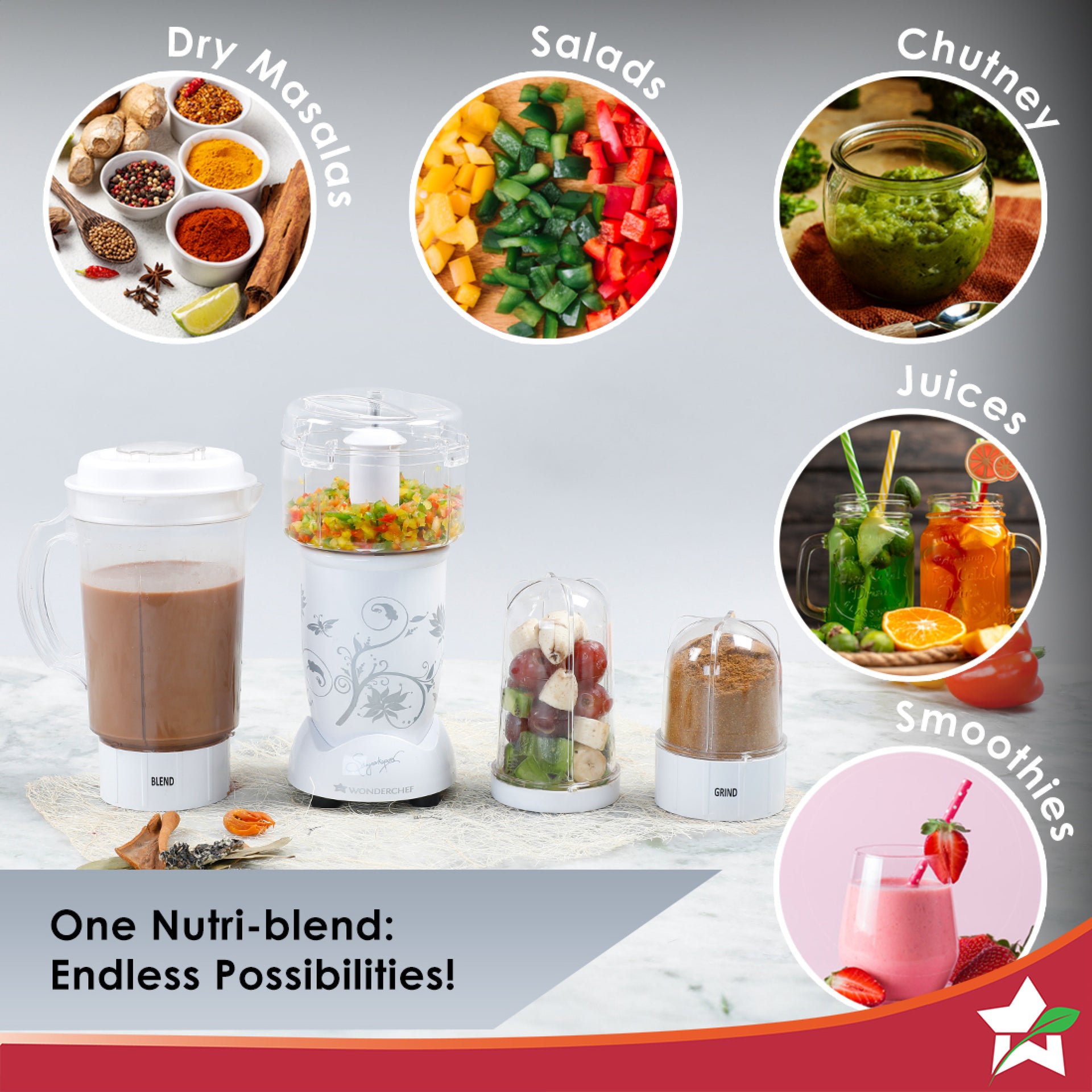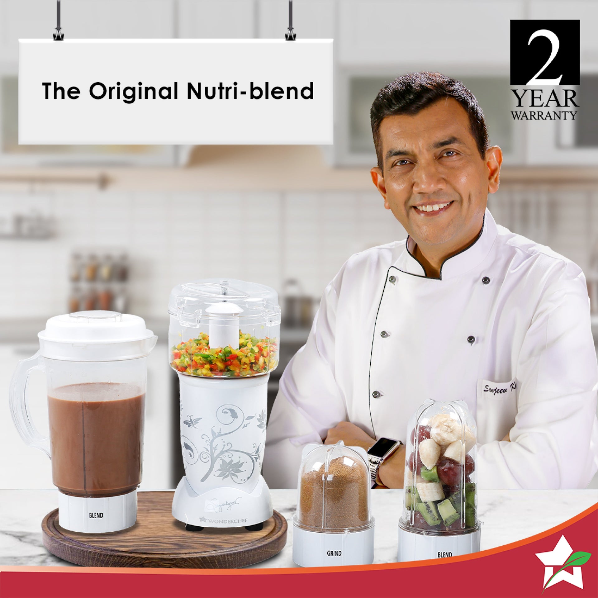 Nutri-blend Juicer, Mixer, Grinder, Smoothie Maker & Chopper | Complete Kitchen Machine | 22000 RPM Blender, Chopper, Juicer | 400W 100% Full Copper Motor | SS Blades | 4 Unbreakable Jars | 2 Years Warranty | Recipe Book By Chef Sanjeev Kapoor | White