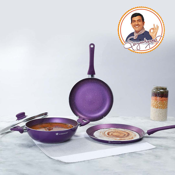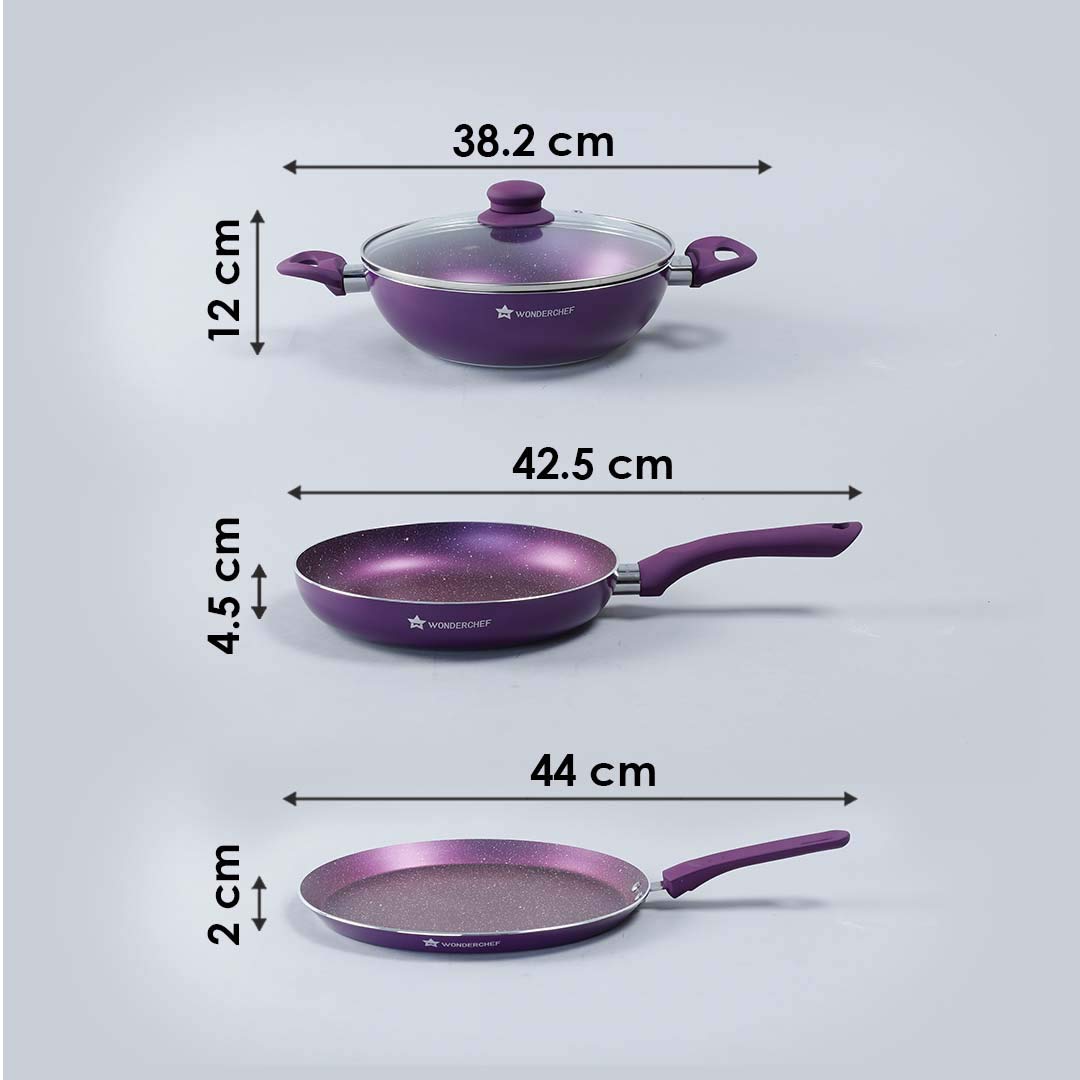 Orchid Non-Stick Cookware 4 Piece Set | Kadhai with Glass Lid 2.7L, Dosa Tawa 28cm, Fry Pan 24cm | Induction Bottom | Soft Touch Handles | Pure Grade Aluminium | PFOA Free | 2 Year Warranty | Purple