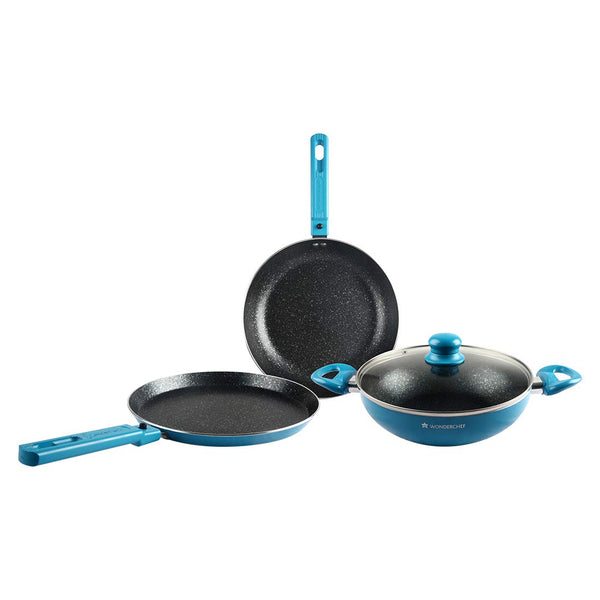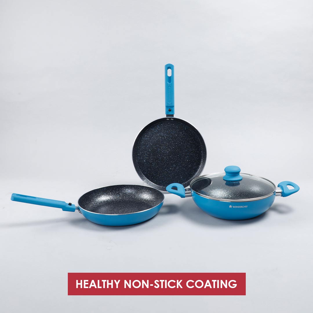 Power Non-Stick Cookware 4 Piece Set | Kadhai with Glass Lid 2.6L, Dosa Tawa 25cm, Fry Pan 24cm | Induction Friendly Bottom | Soft Touch Handles | Pure Grade Aluminium | PFOA Free | 2 Years Warranty | Blue