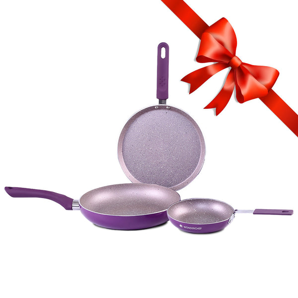Enhance your cooking and dining experience with the most popular Wonderchef Royal Velvet cookware range. The marble finish gives the aluminium cookware a stylish and modern look. Wonderchef Renewed Royal Velvet 3-piece set includes 24cm Fry Pan, 24 cm Dosa Tawa and a 14 cm Mini Fry Pan, thus providing a complete cooking solution for healthy and low-fat home-cooked meals. Finest non-stick coating for healthy, low fat, and delicious meals.
