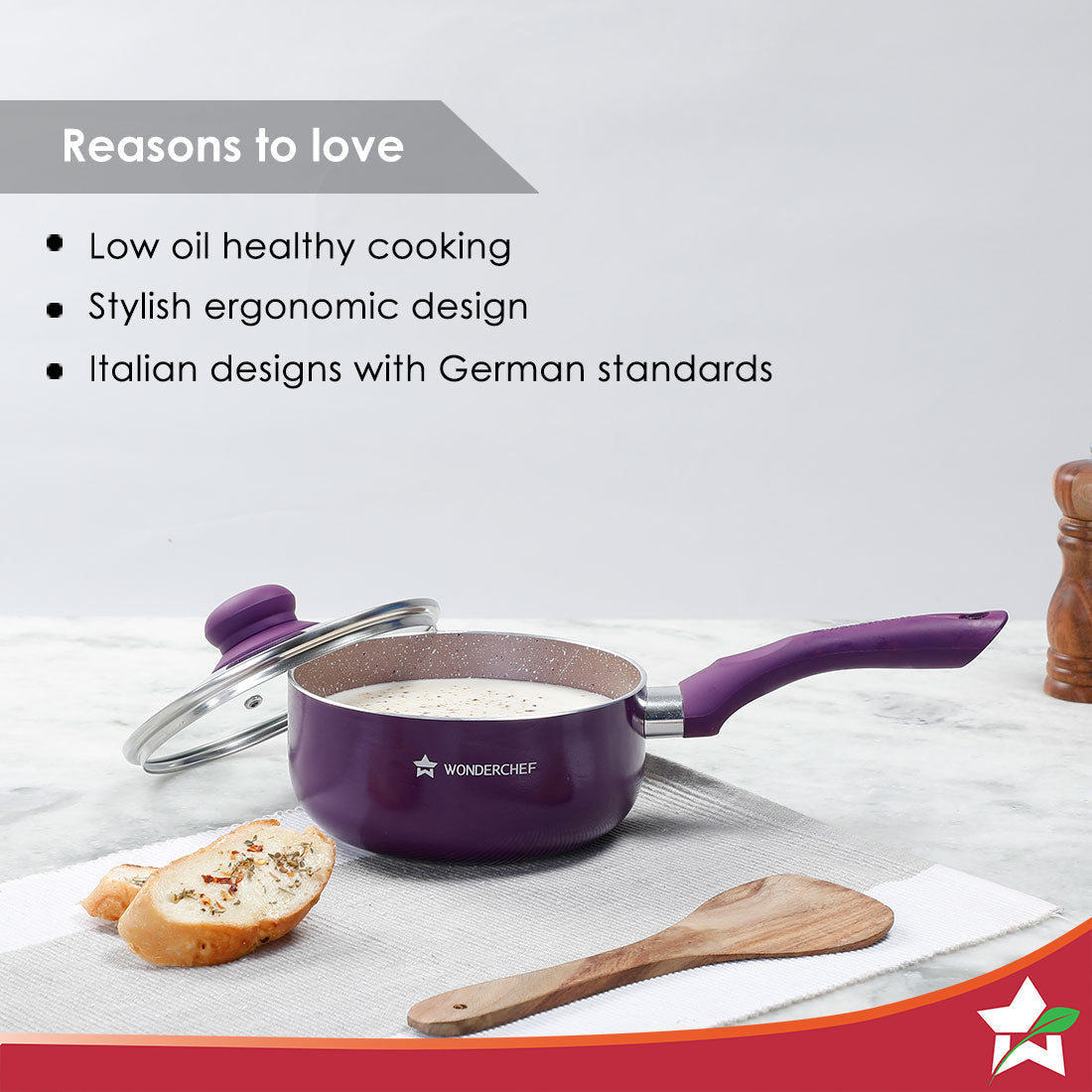 Enhance your cooking and dining experience with the most popular Wonderchef Royal Velvet Sauce Pan. The marble finish gives the aluminium cookware a stylish and modern look. It is a complete cooking solution for healthy and low-fat home-cooked meals. Finest non-stick coating for healthy, low-oil cooking everyday.