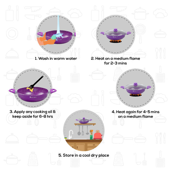 Hand wash only with a non-abrasive sponge. Allow pans to cool completely before washing. Never immerse a hot pan in cold water or use abrasive cleaning pads or cleansers that can damage the pan and void the warranty. Do not nest pans one inside the other or put lids between pans as this may damage the cookware.